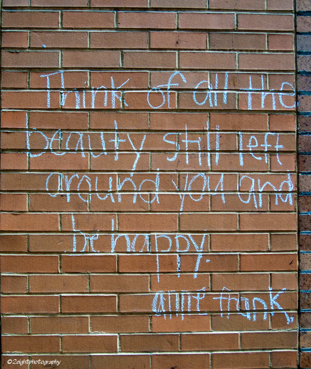 Tonights post is a picture I took last summer while walking around Pittsburgh. I was walking down a little alley and found this written on the wall in chalk. I’ll let the words speak for themselves. I don’t know if this a direct quote or not but it really makes you THINK…..