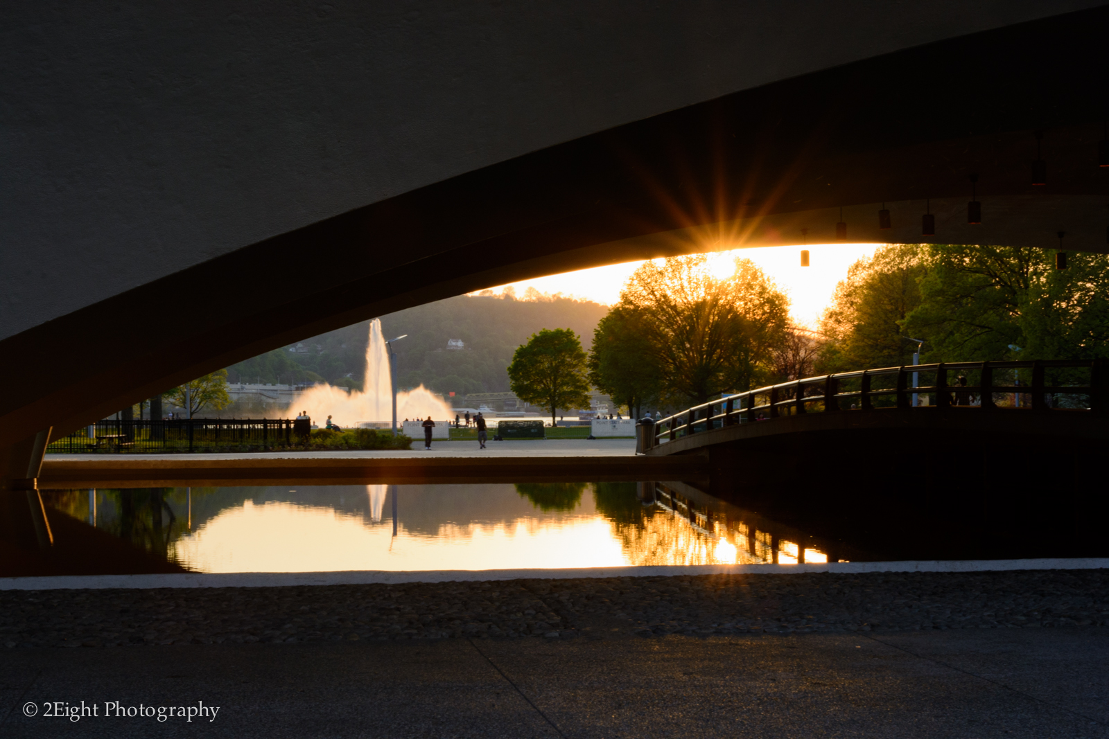 This is a shot of the fountain at Point State park in Pittsburgh.  As I was walking towards the bride to cross I saw the sunset reflecting in the water and thought it might make an interesting composition.