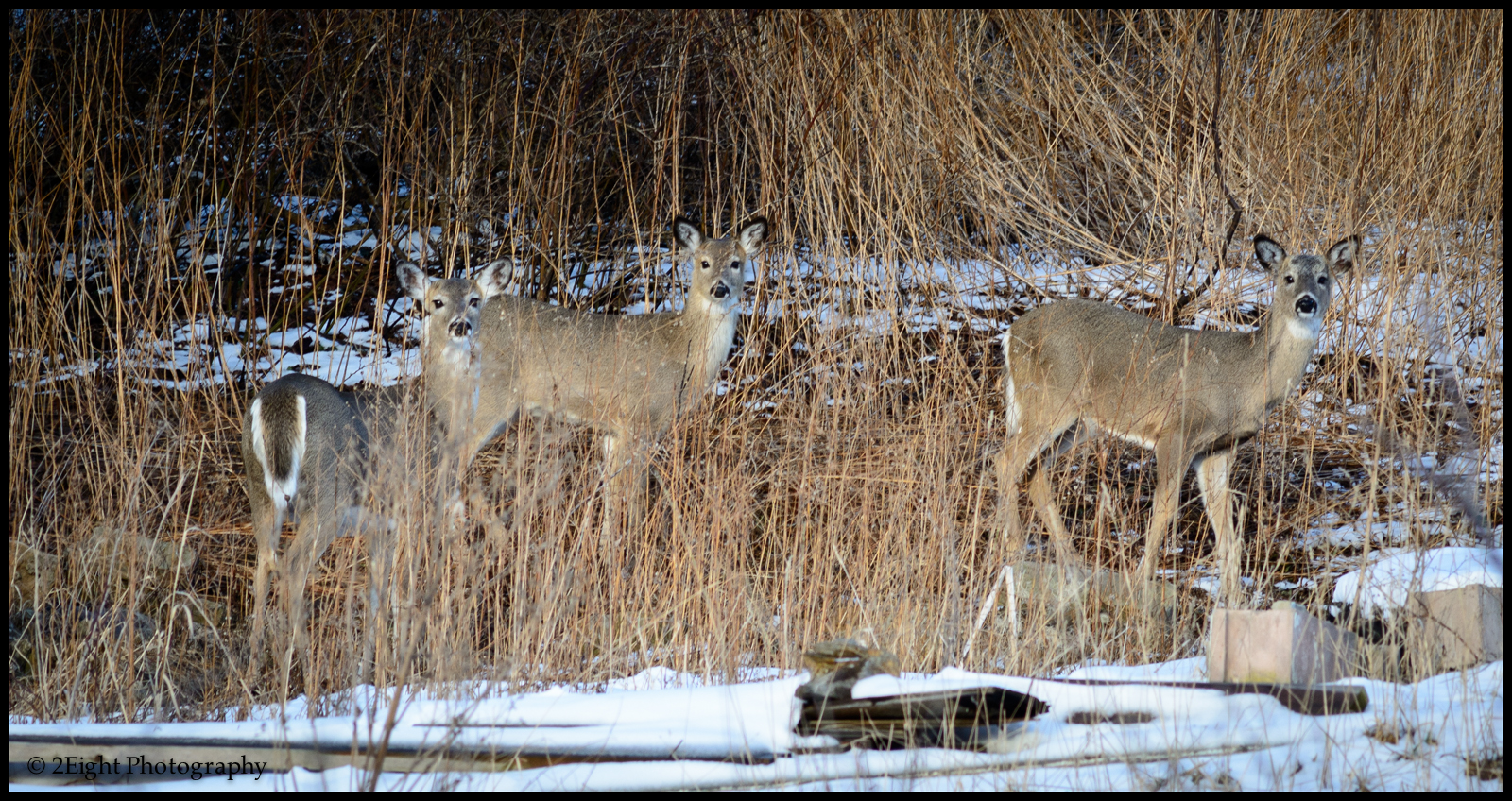 Today I was able to get out and do a little photography and enjoy the warmer temperatures that we were graced with. And as I was driving back I noticed a couple of whitetail deer along the roadside. So I stopped changed lenses on my camera and turned back, pulling off the road and taking their photo from the window of the car. Of course this got me some strange looks and I’m sure a few people were a little curious as to what it was that I was doing, but hey it’s all in the name of photography.