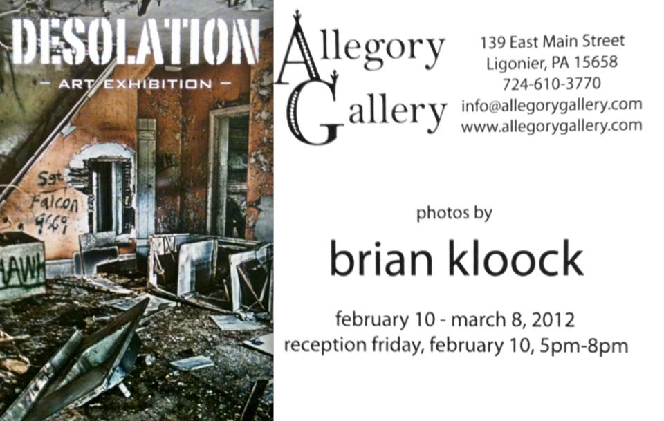As some of you may have seen I have been working on a series of photographs which I have been referring to as “Desolation”. The series is based on abandoned buildings and houses throughout the region. I started this series last year with the intentions of just getting a few interesting shots from an old house that I had come across. I can certainly say that I instantly was fascinated with the idea of the these forgotten places. Since then I have been photographing and visiting as many places that time allows and the series has been growing. Starting tomorrow night I will have an exhibit of some of this series at the Allegory Gallery in Ligonier, Pa. The opening will be Friday, February 10, 2012 from 5pm to 8pm. The show will run through March 8, 2012. If you are in the area please stop by and take a look at the show and let me know what you think.